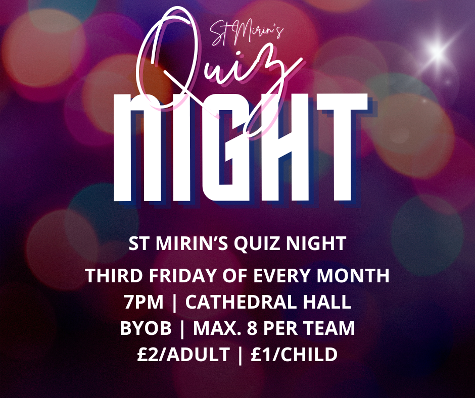 Our monthly Quiz Nights are hugely popular but there’s always room for one more team! The whole family is welcome to come along and join in. They (usually) take place on the third Friday of every month. Check the bulletin for the date of the next Quiz Night. See you there!
